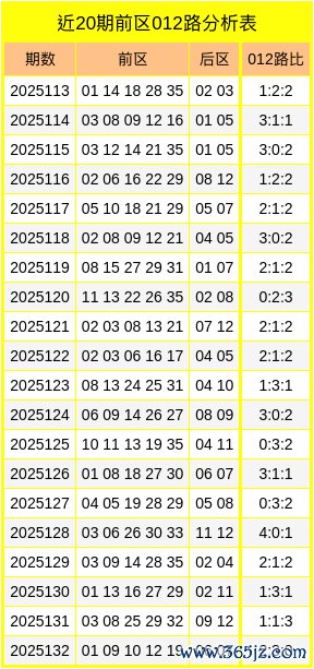 概括分析,第25133期大乐透前区012路比参考2:2:1。